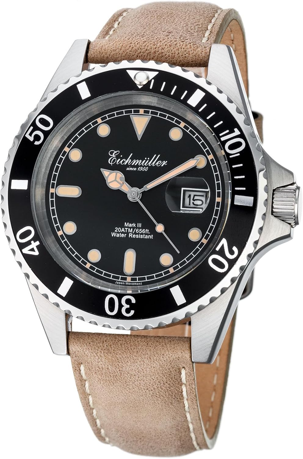 Eichmüller Men's Brown Dive Watch with Magnifying Glass Date Display and 20 ATM Rotating Bezel, BrownBlack, Straps
